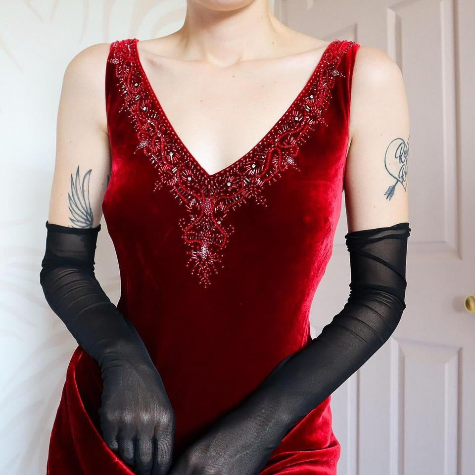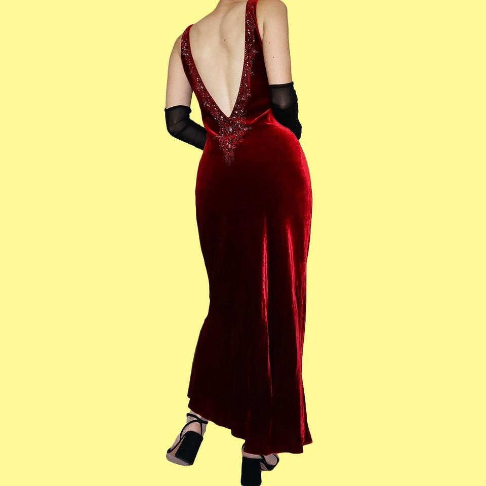 Red silk blend velvet evening dress with bead detailing to the front & back & a low back UK 14