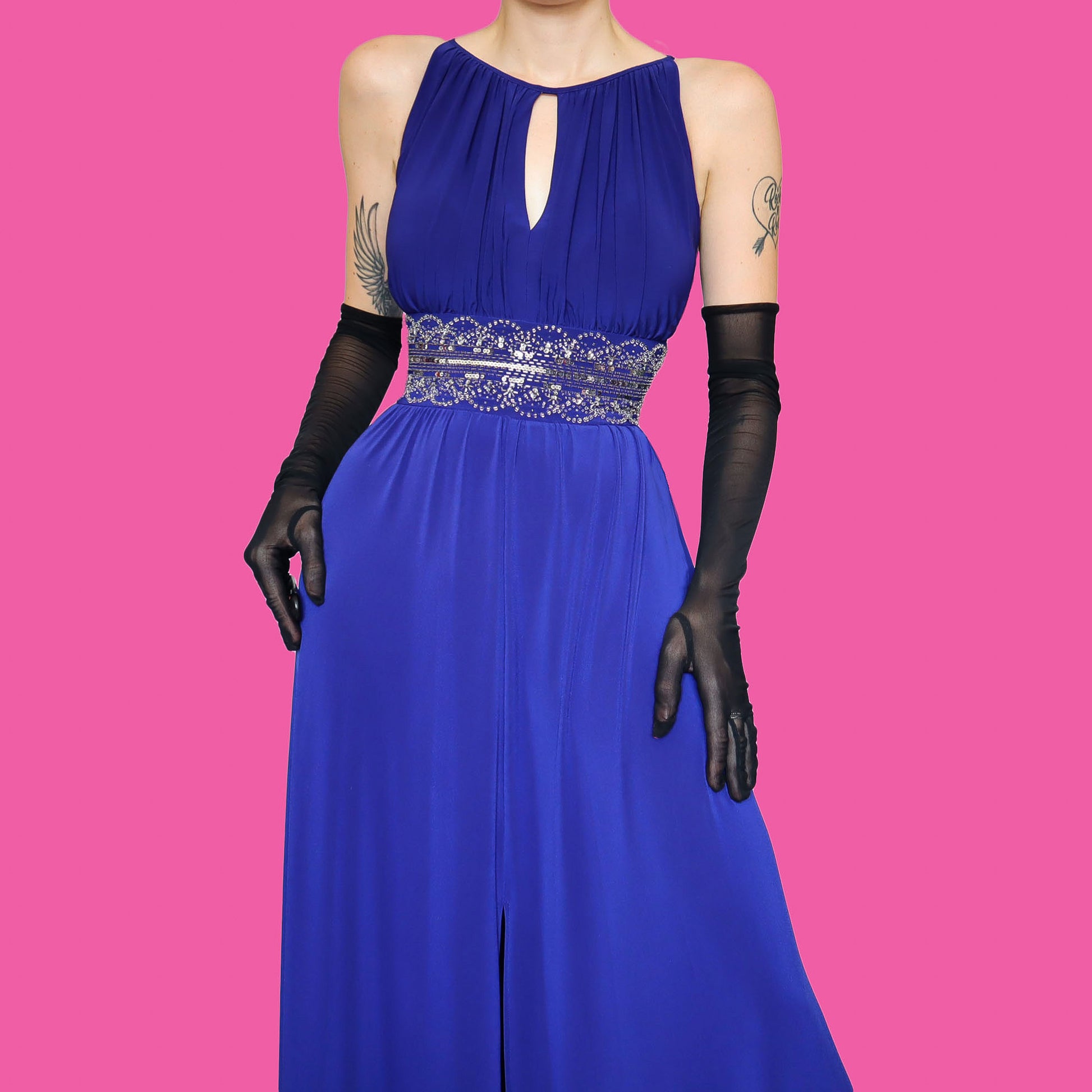 🌹Royal blue stretchy evening dress with a slit up the front, a sequin & bead detail waist, a padded bust, a zip up the back & a tie at the back of the neck UK 16🌹