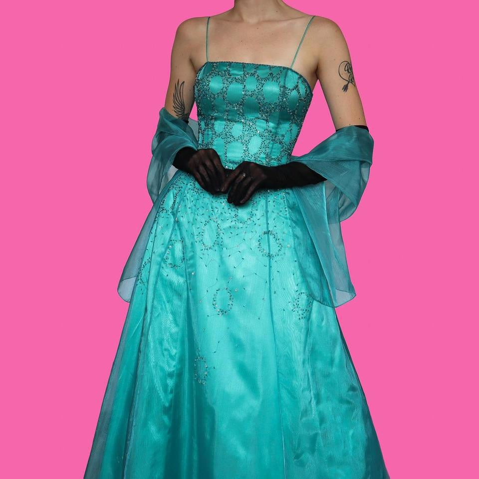 🌹Stunning sapphire a line evening dress with a padded bust, bead detailing, a zip up the back, a netted underskirt to hold the shape of the dress & a matching shawl UK 12🌹