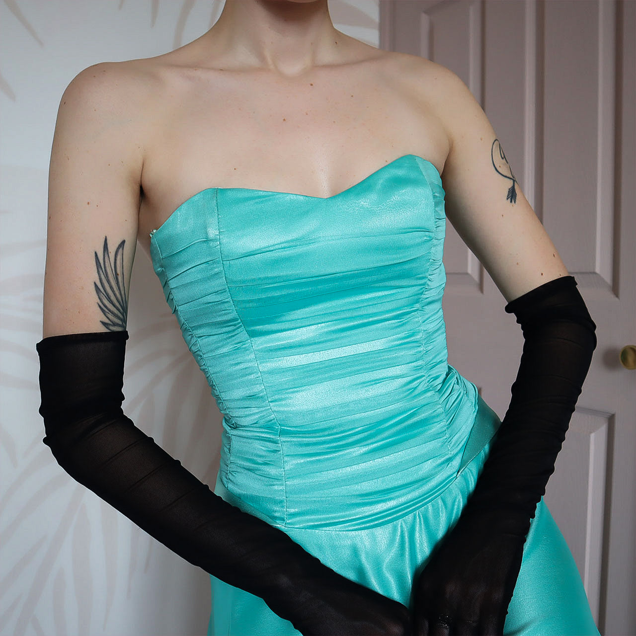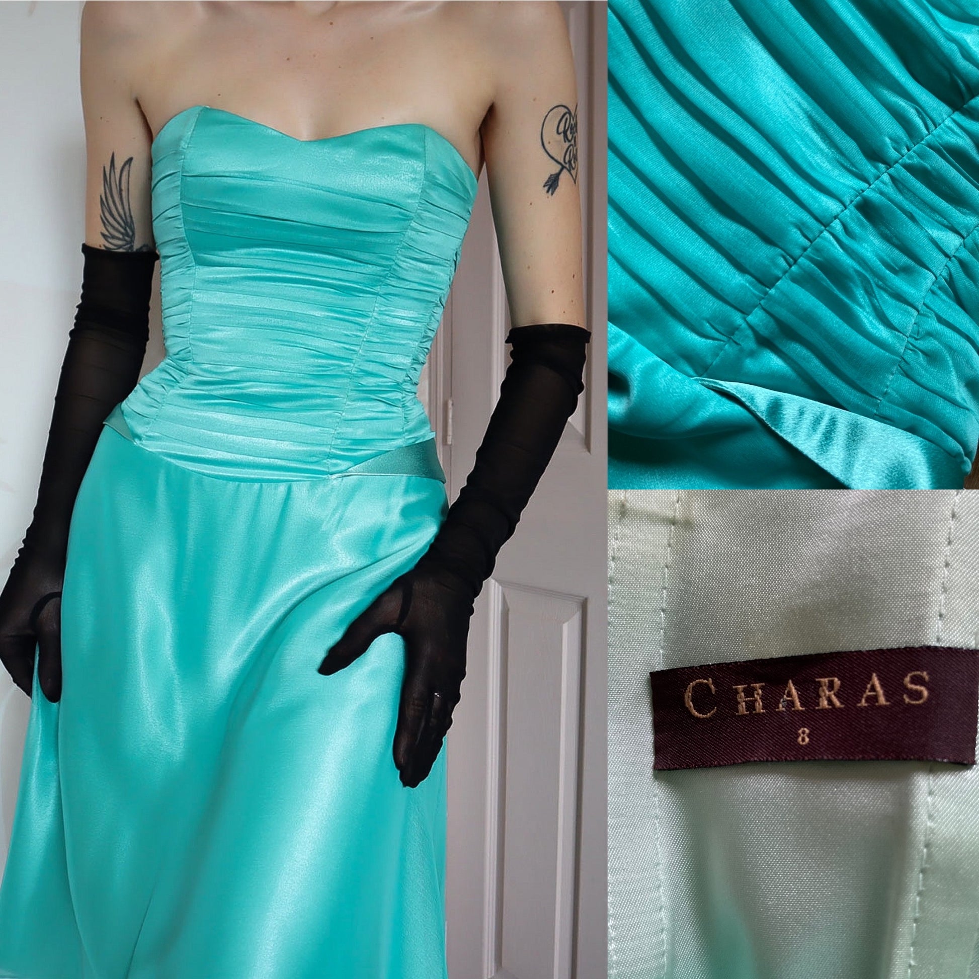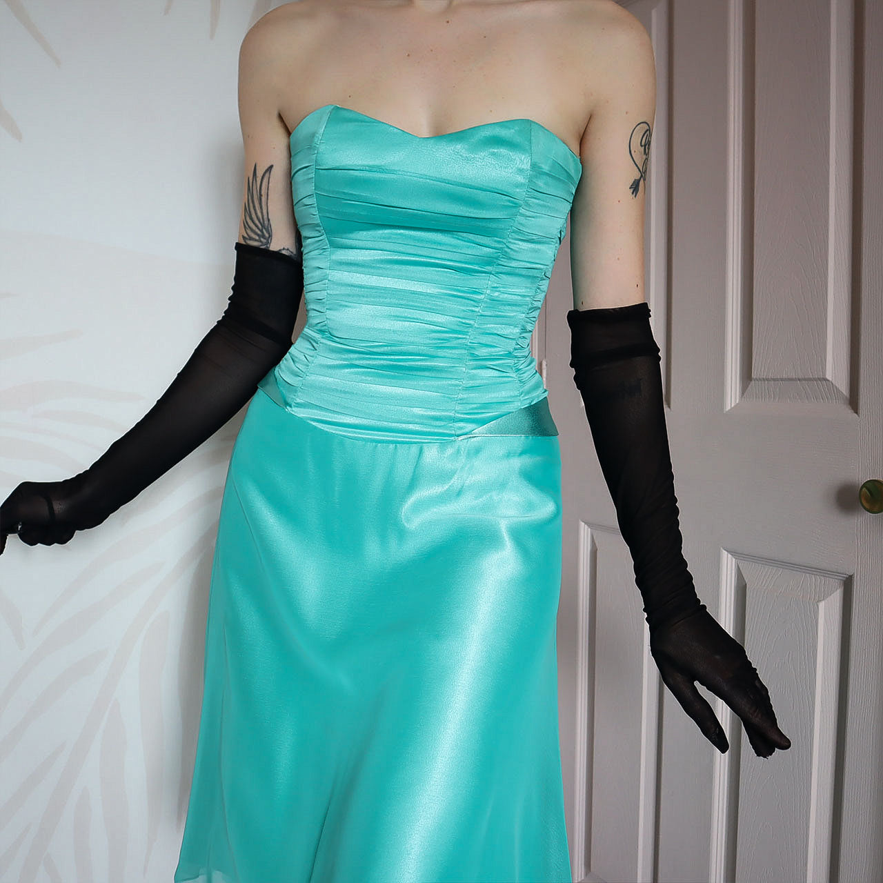 Sapphire strapless midi dress with a boned bust & waist, a lace up adjustable back, a longer frill detail hem & a zip up the back UK 8