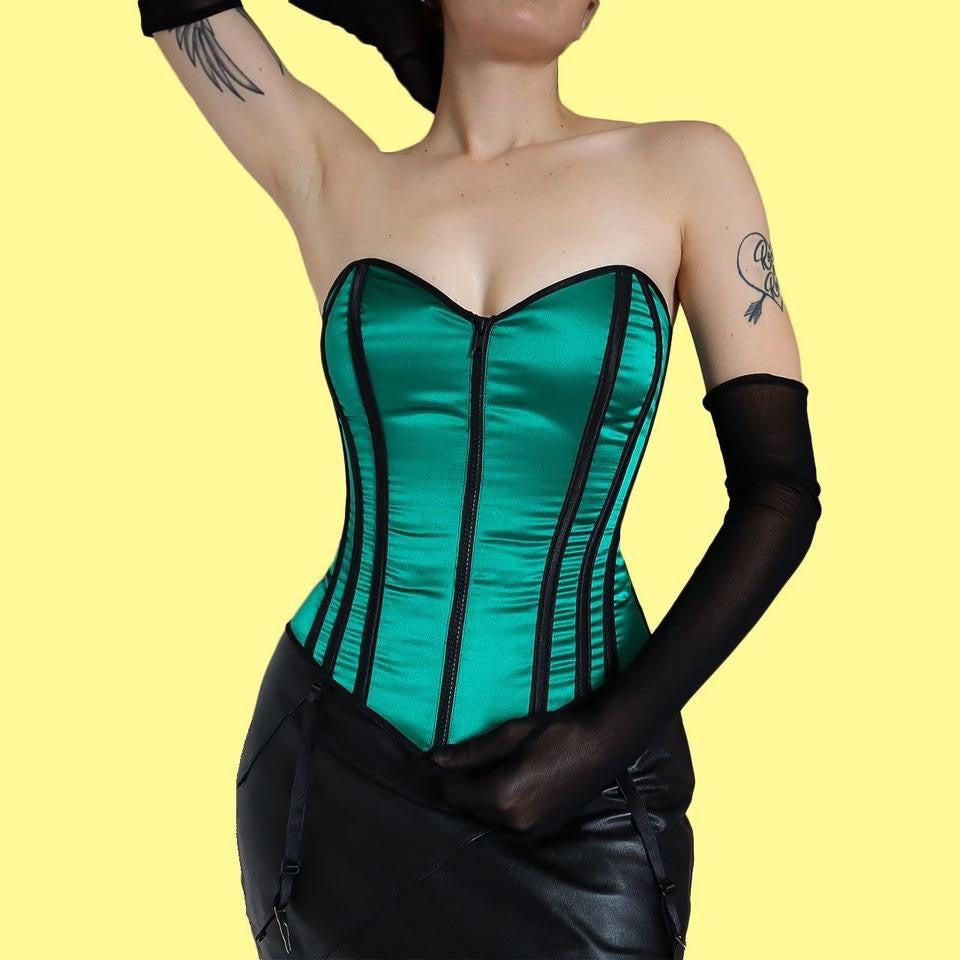 Green boned corset with a zip up the front, adjustable lacing to the back & removable suspender straps UK S