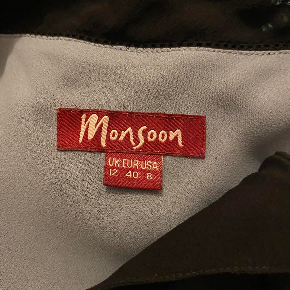 Silky black 30% silk blend evening slip dress with a floral paisley print, grey lining, sequin/bead detailing & a chiffon frill to one shoulder UK 12