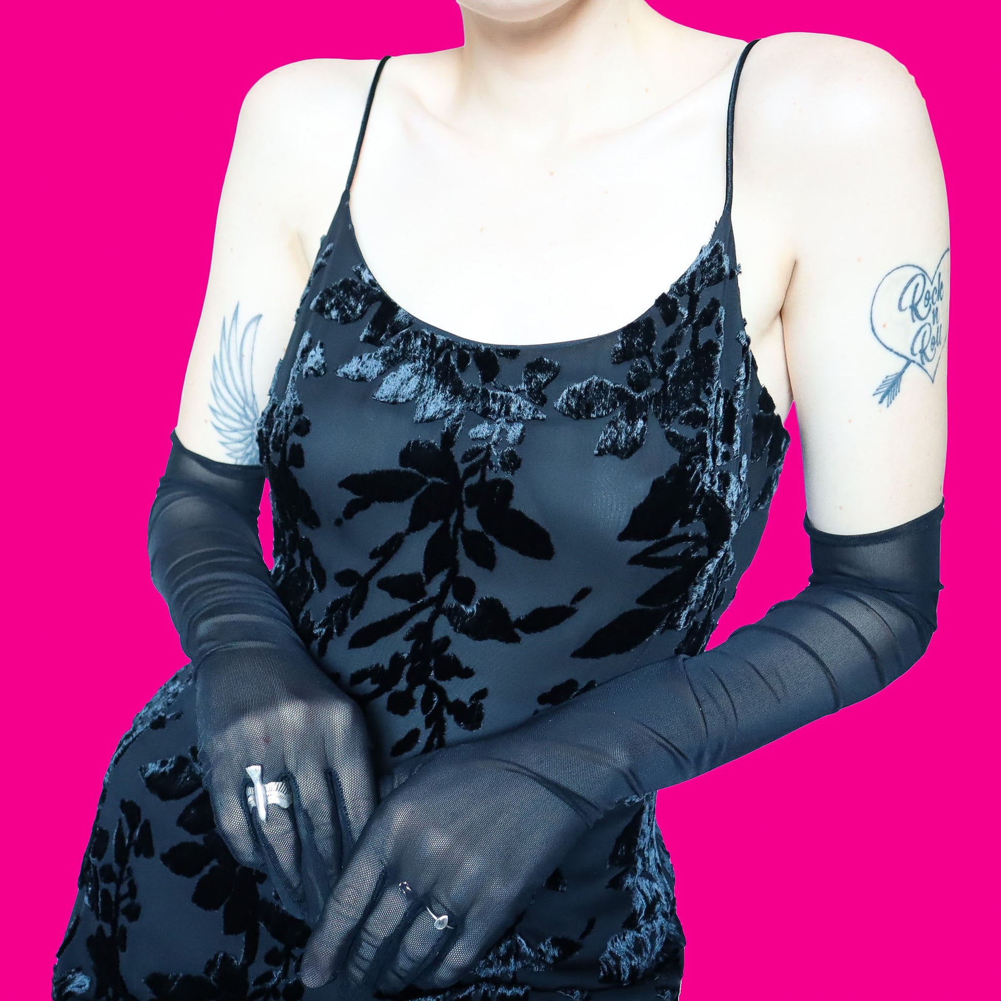 🌹Black velvet dress UK 14🌹Stunning 25% silk blend sheer black devore velvet slip dress with two slits down the front & a zip up the back🌹The dress is lined but still slightly sheer🌹