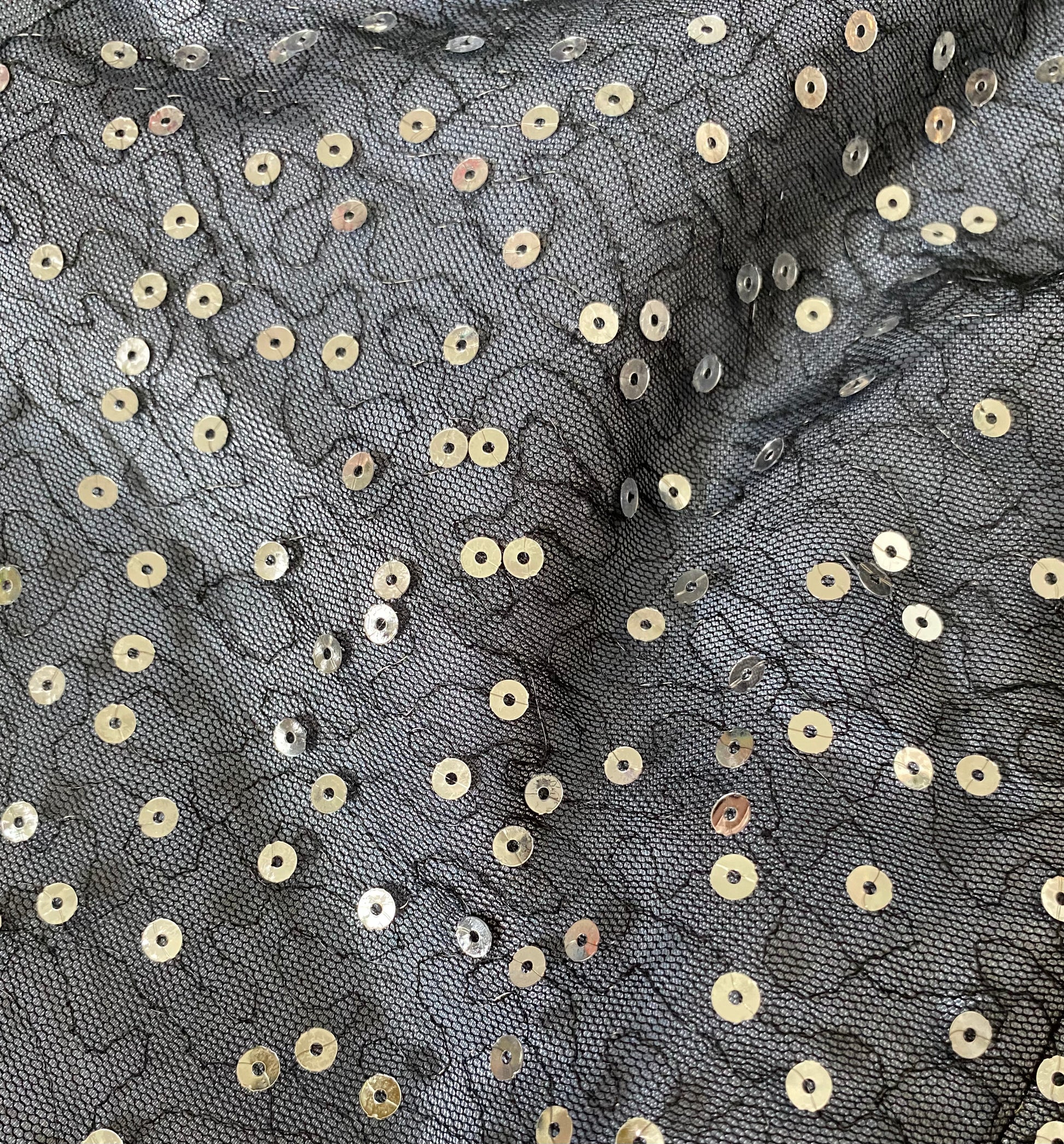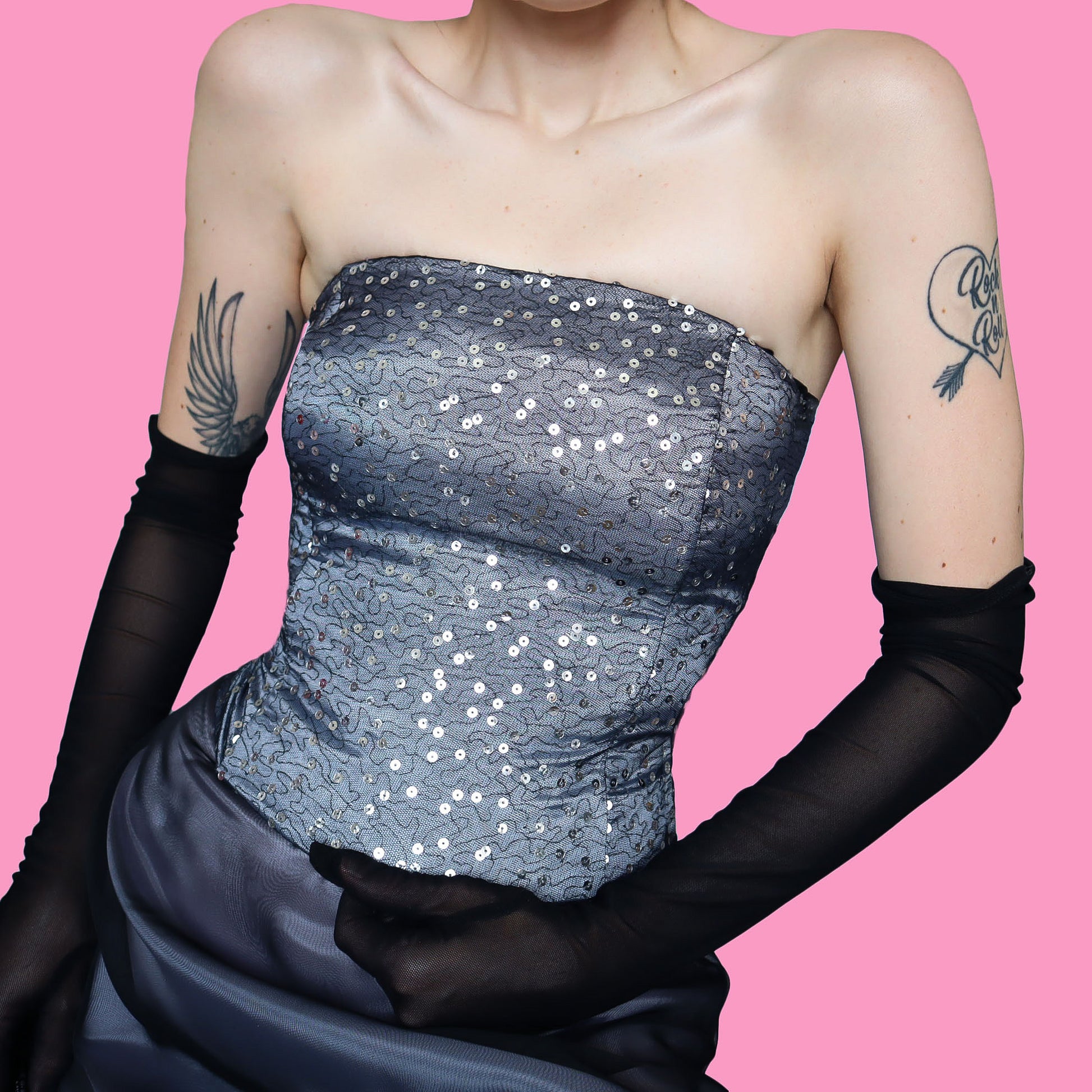 🌹Silver 2 piece skirt & top set UK 12 - the skirt is a- line with a sheer black overlay, high waist & a zip & hook & eye fastening at the back - the top is sequinned with a fully adjustable lace up back🌹