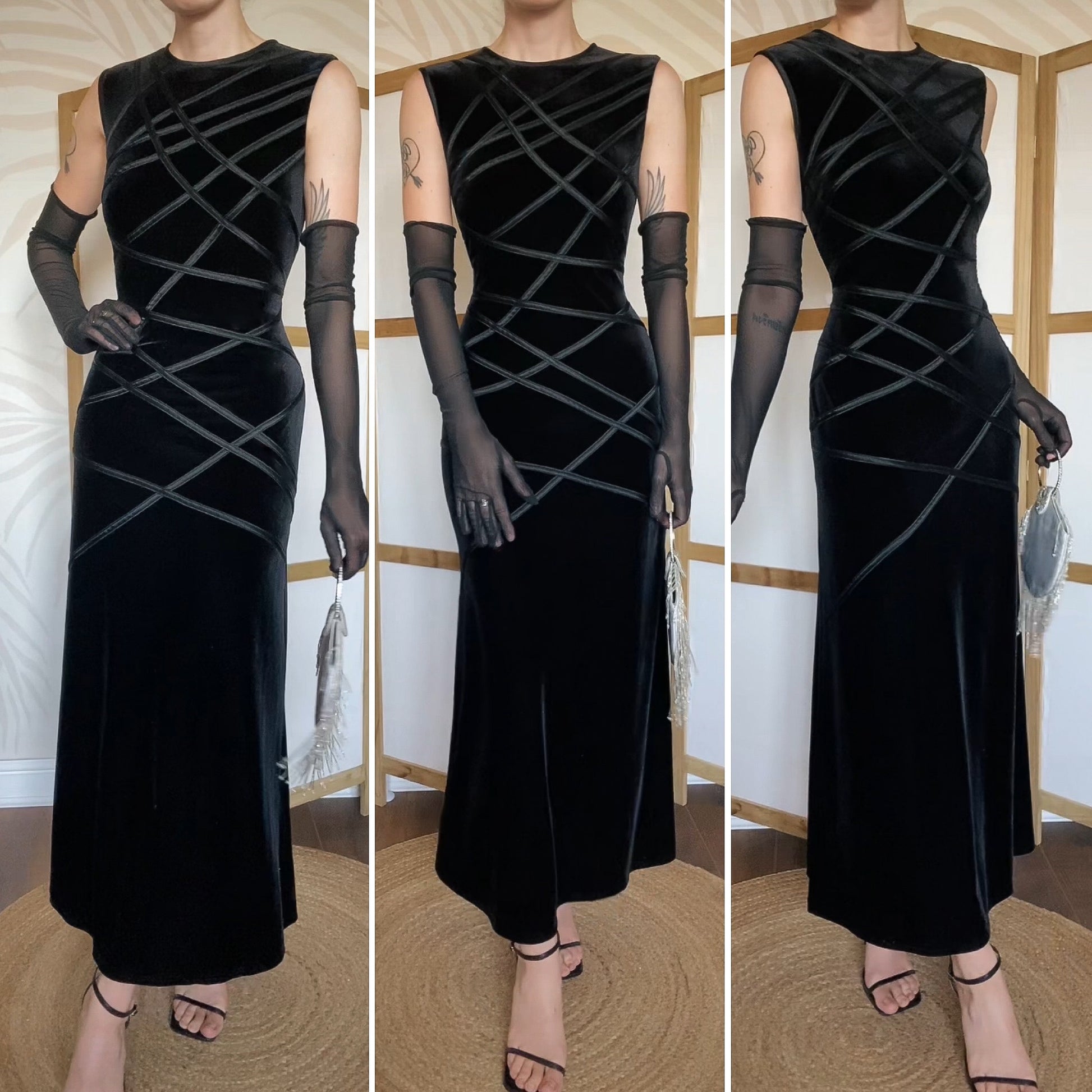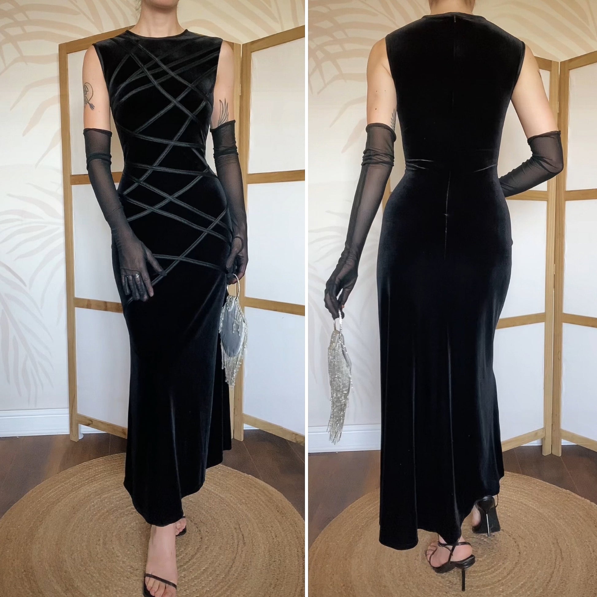 Stunning Simon Ellis black velvet stretch evening dress with a zip up the back uk 14