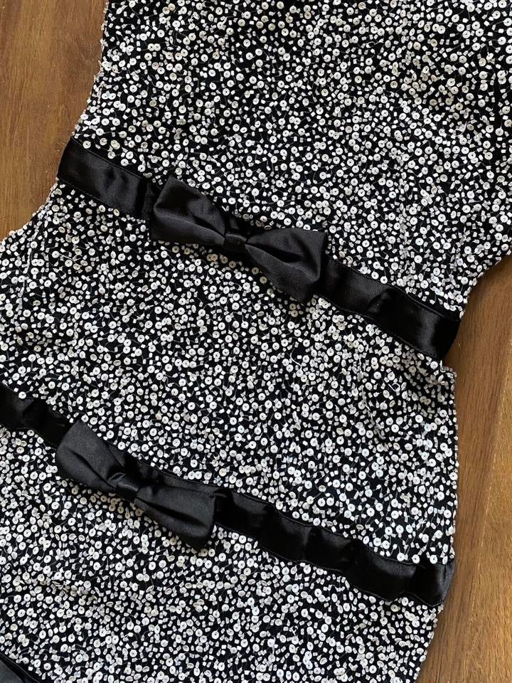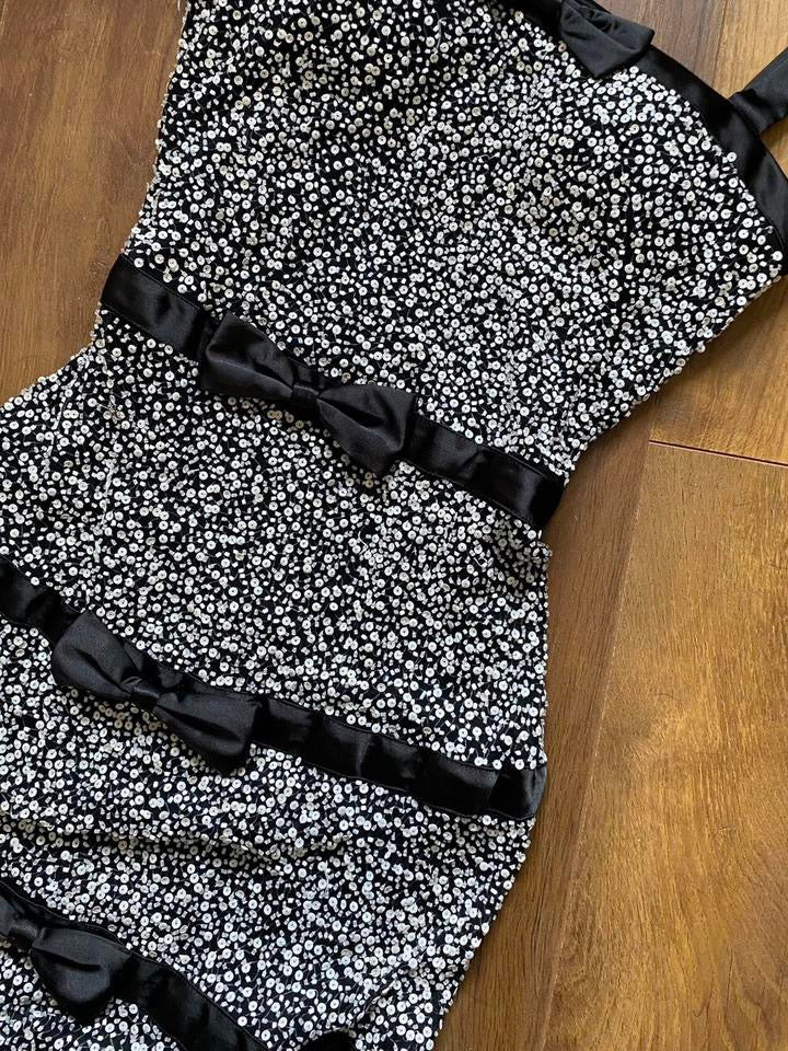 Black & white 100% silk beaded/sequin evening dress with cute bow detailing, a padded bust & a zip up the back uk 6-8