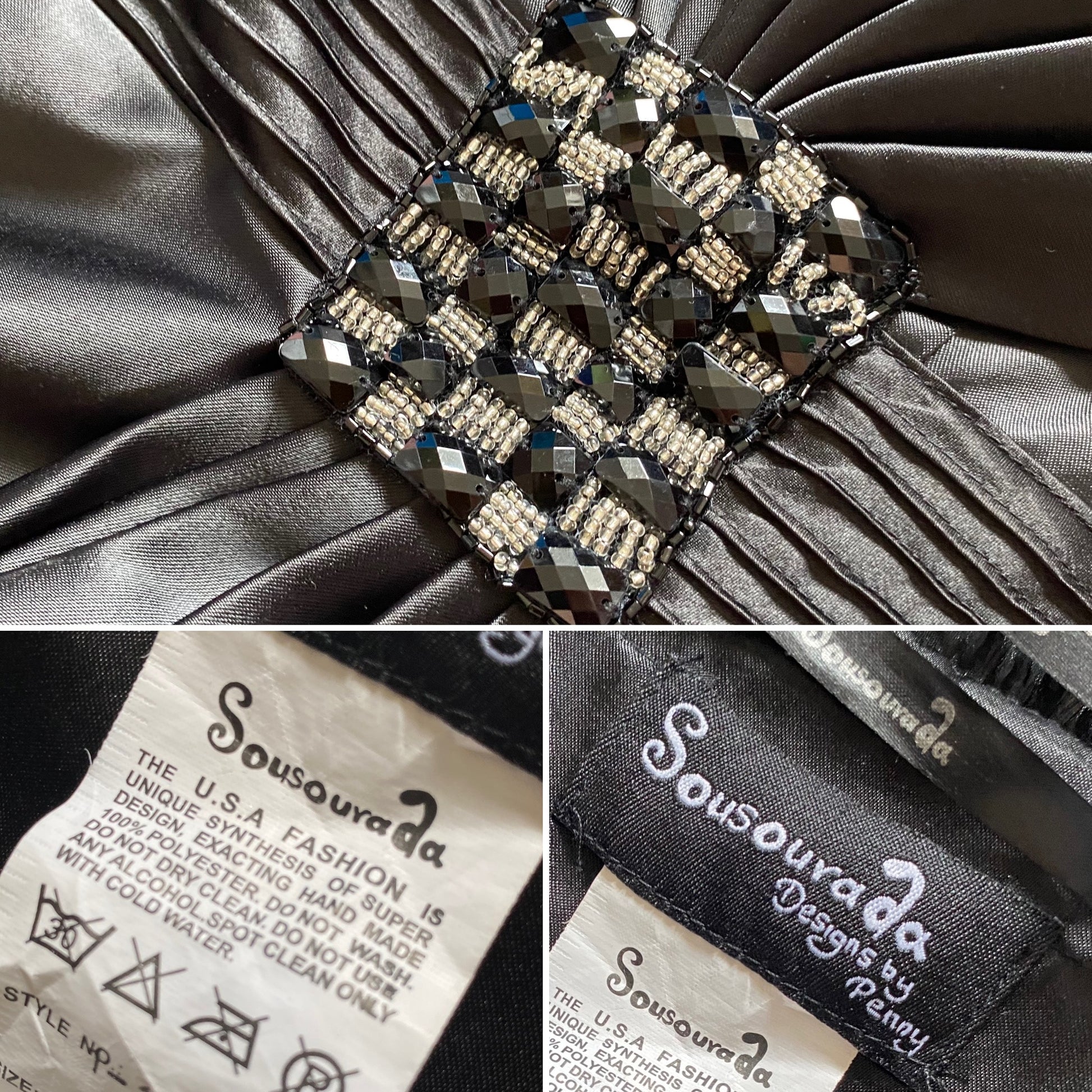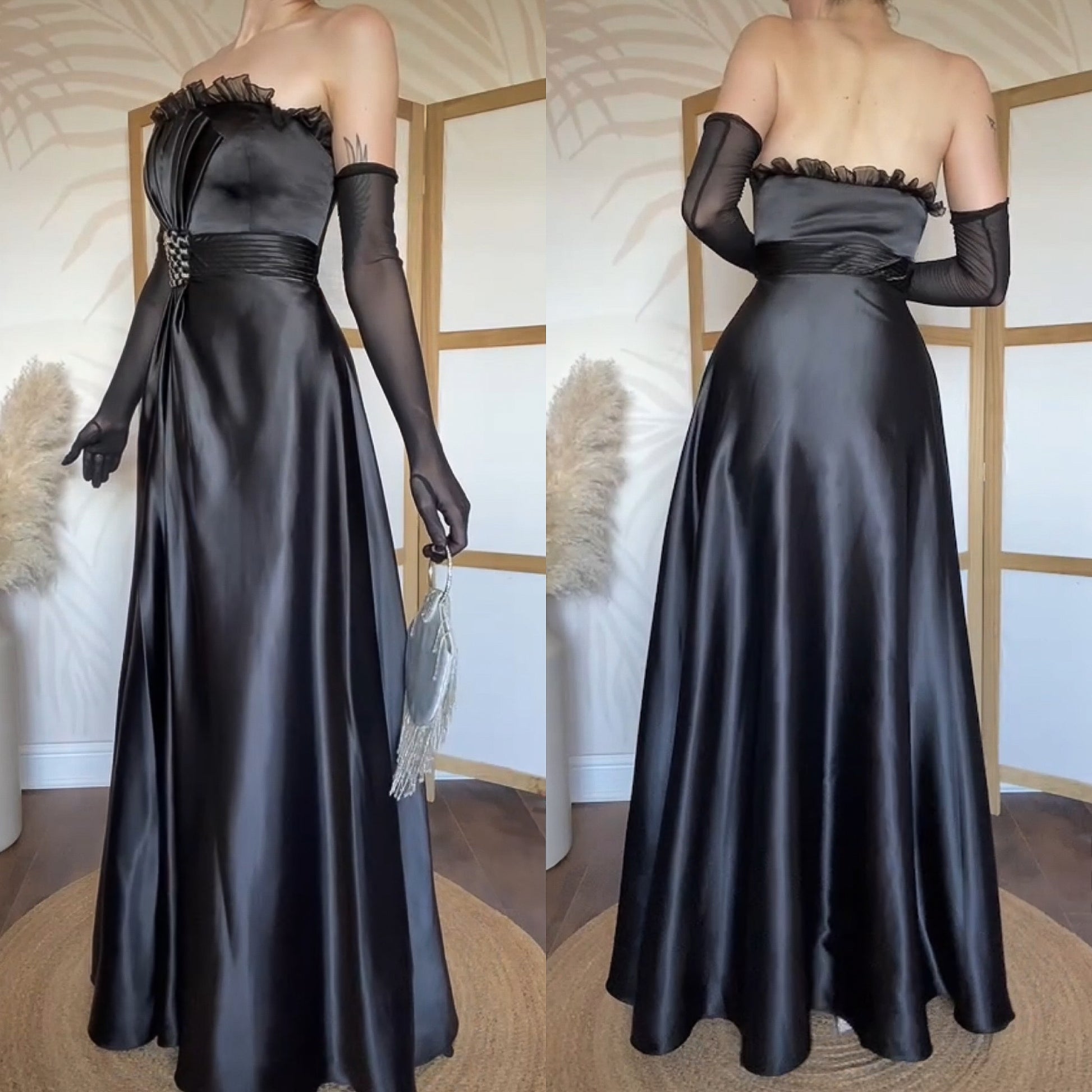Beautiful black satin strapless prom dress with a padded bust, a boned bust & waist, fit & flare shape, a gem & bead detailing to the waist & a zip up the back uk 10
