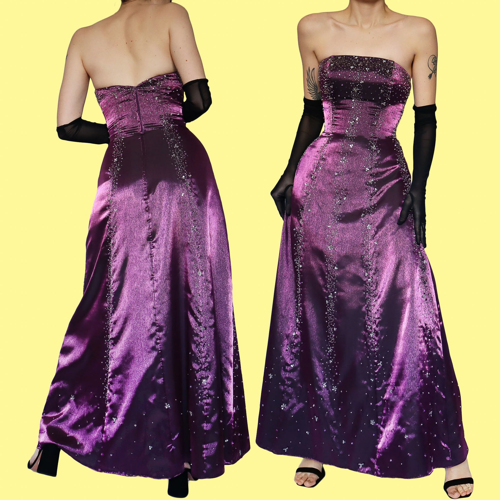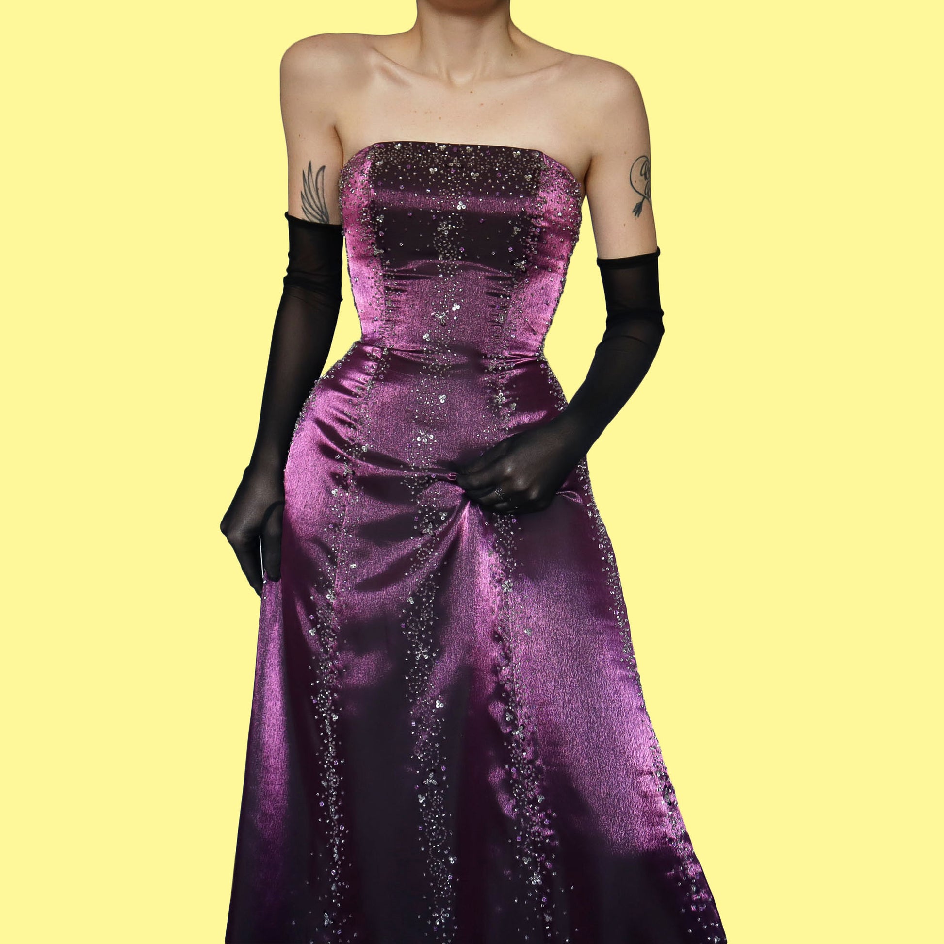 🌹Purple a line strapless dress UK 8-10🌹Beautiful silky purple a line evening dress with bead detailing, a netted underskirt to hold the shape of the dress, a boned bust & a zip up the back🌹