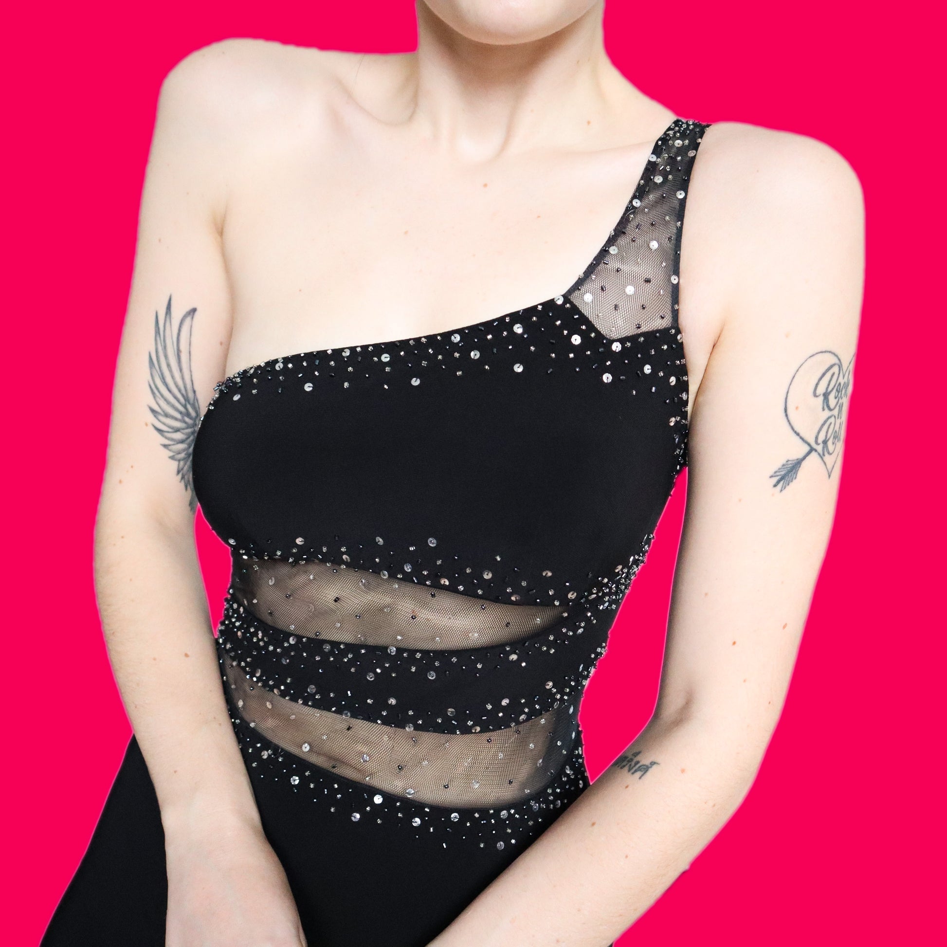 🌹Stunning black stretch one shoulder evening dress with sheer panel waist & back, a padded bust, sequin & bead detailing & a zip up the side UK 10🌹