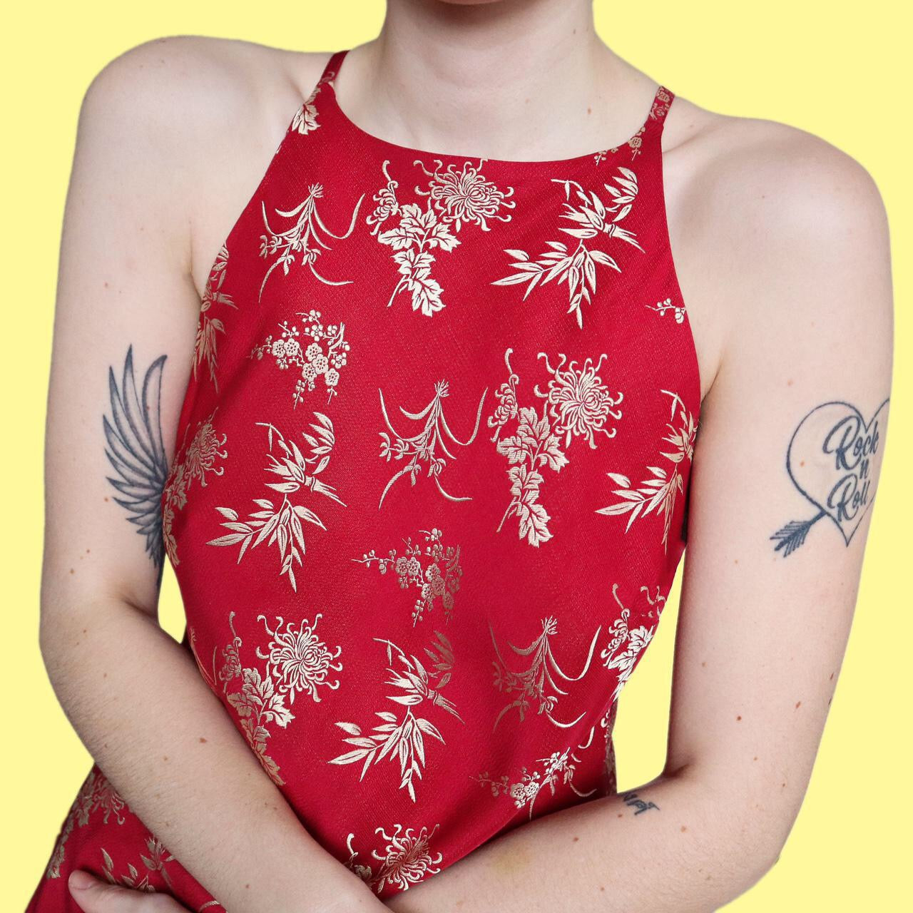 🌹Beautiful petite red & gold evening dress with two button fastenings at the back of the neck UK 12🌹