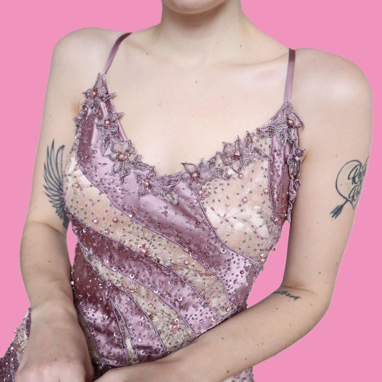 🌹Stunning silky lilac evening dress with a padded bust, bead detailing, lace stripe detailing, a zip up the side & a matching shawl UK S🌹