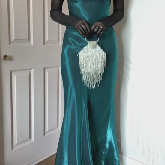 Stunning silky teal evening dress with a cowl neckline, a long trail down the back & a zip up the back UK 12