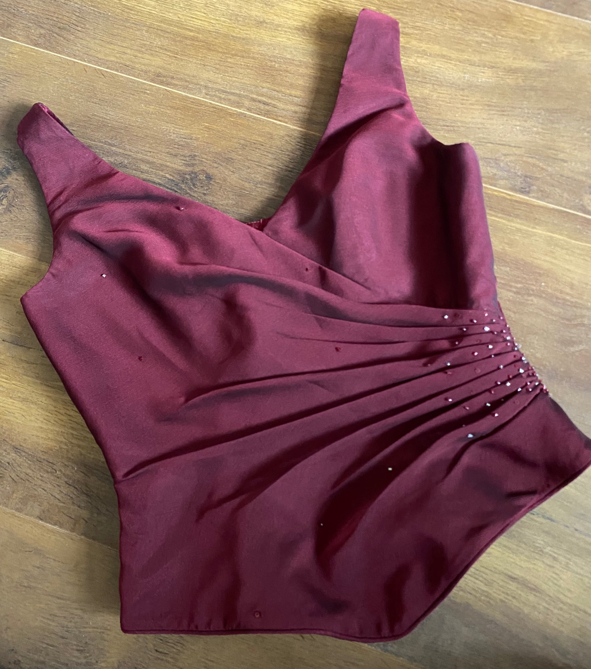 Burgundy 2 piece top, skirt & shawl prom set uk 8 - the top is beaded & boned with button fastenings at the back - the skirt is high waist with a zip fastening at the back & a slightly longer hem at the back