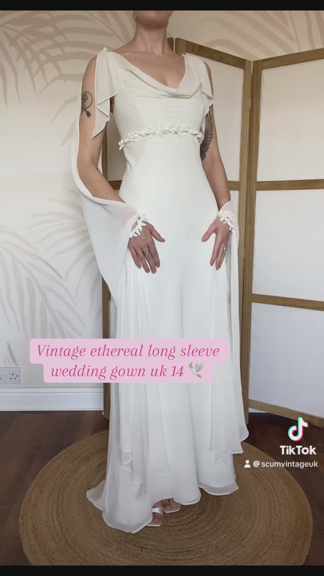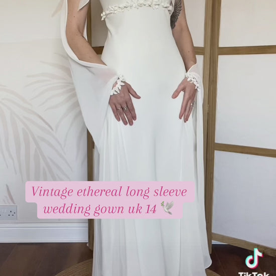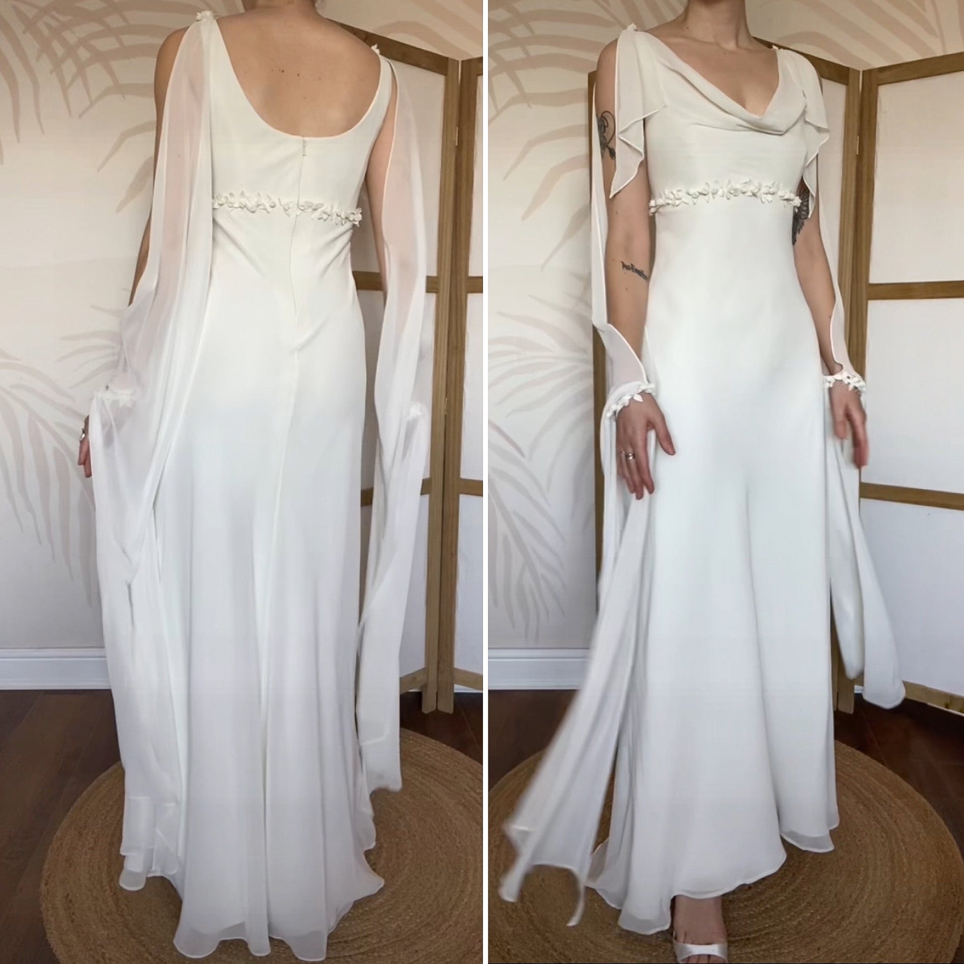 Beautiful white ethereal wedding dress with floral detailing to the waist, shoulders & cuffs, long open sleeves with strappy cuffs that have a popper fastening - the dress has a zip up the back & a cowl neckline UK 14