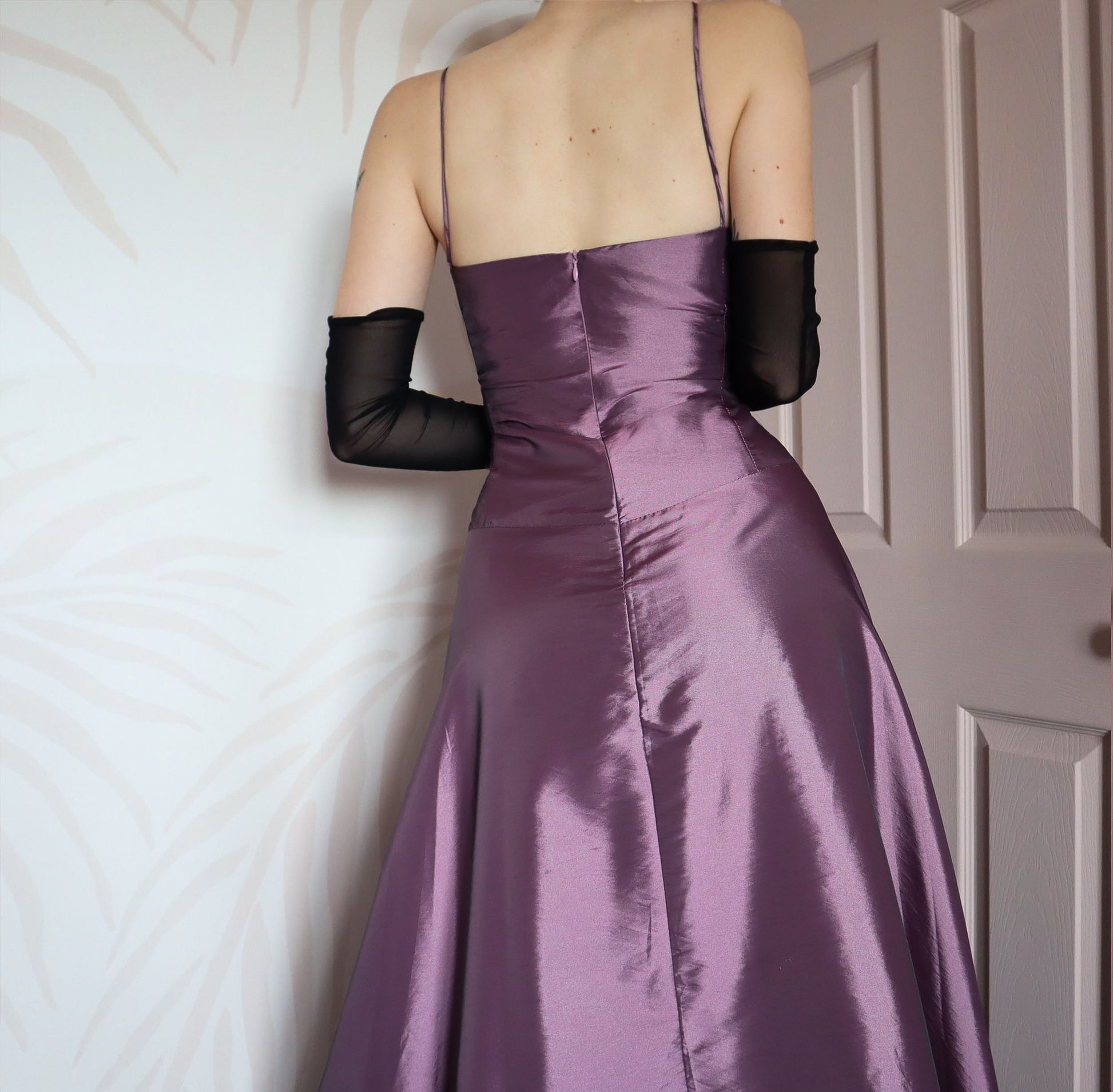 Purple fit and flare evening gown with flocked floral/glitter detailing, a diamanté detail waist, a boned bust & a zip up the back UK 18-20