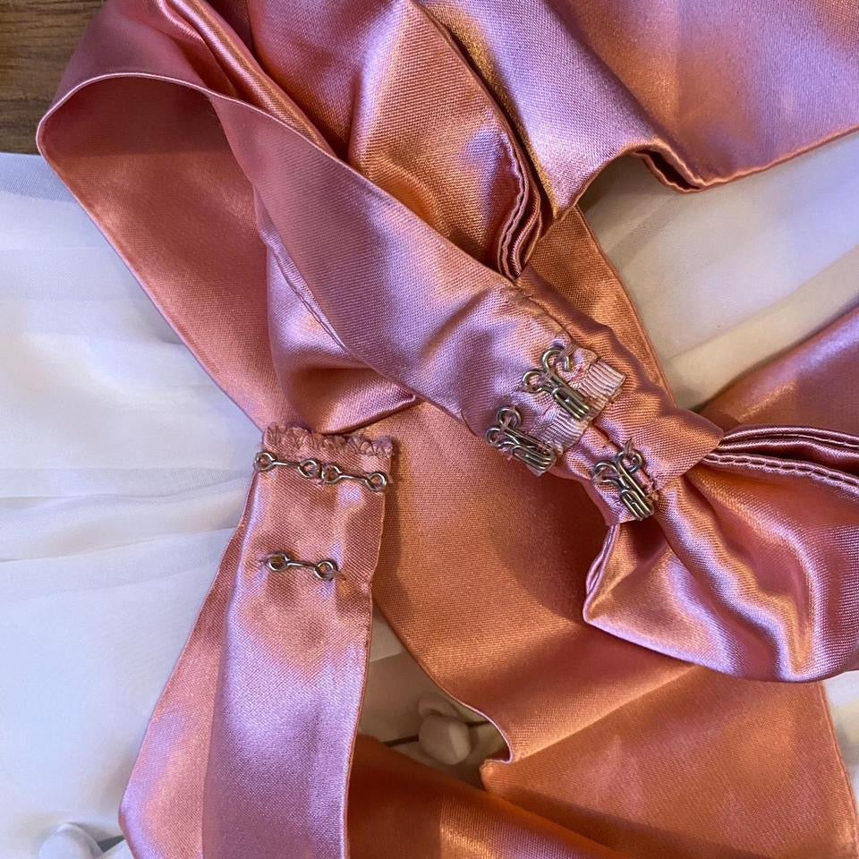 Please note on sizing - the dress can be worn looser, the pink satin waist belt is 25” and can’t be adjusted without altering so it ranges in sizing depending on the fit you would like