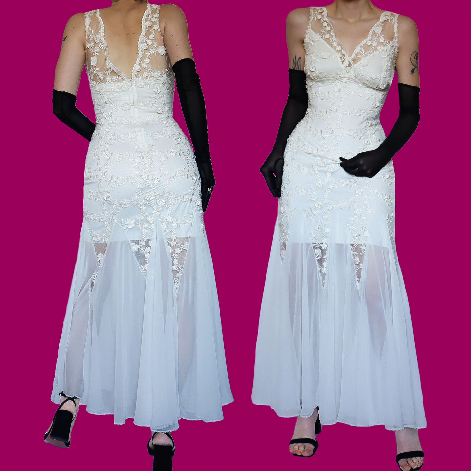 🌹White lace evening dress UK 10🌹Beautiful off white lace stretch evening dress with a sheer chiffon hem & a zip up the back🌹