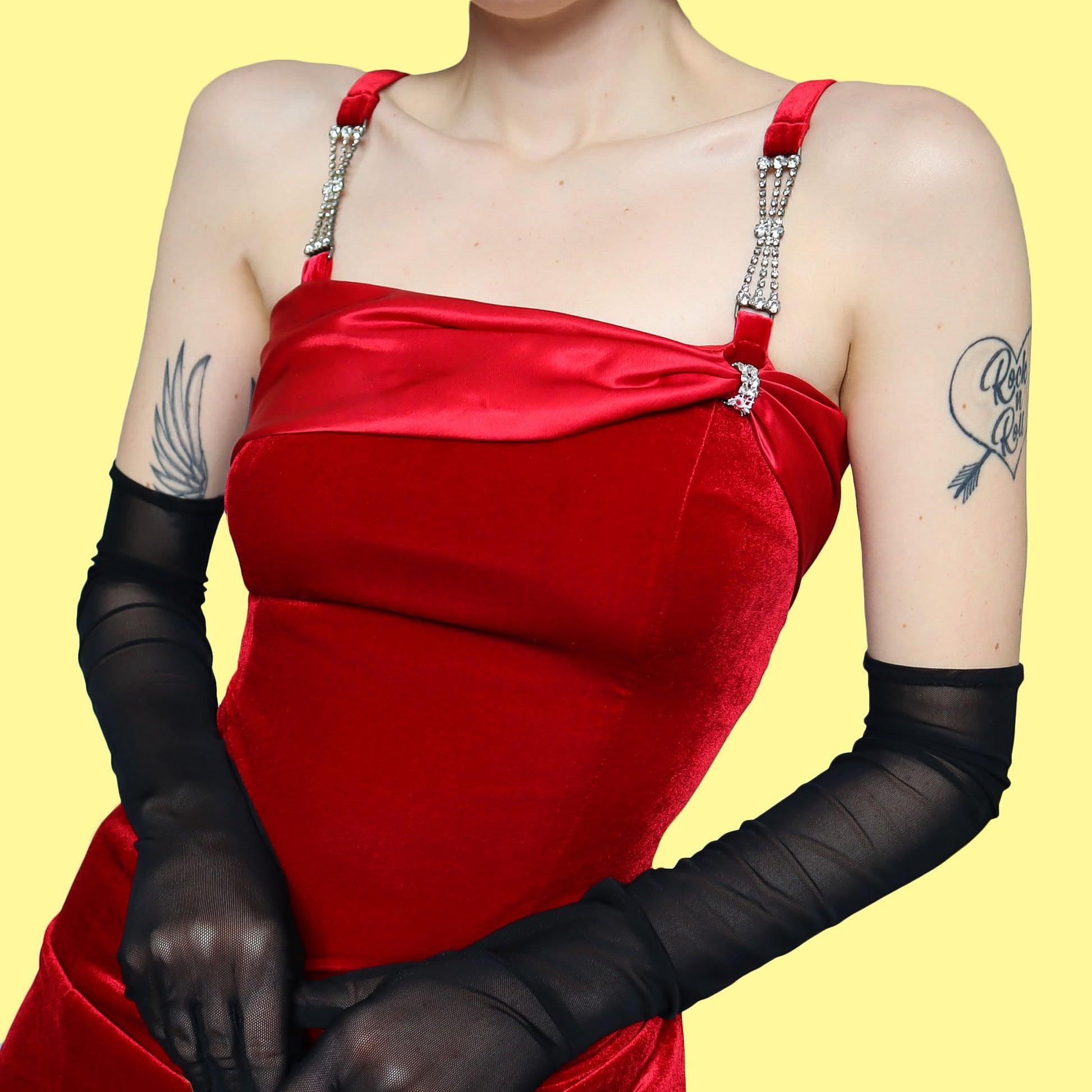 🌹Red velvet stretch evening dress with diamanté detail straps, a slit up one leg & a zip up the back UK 14-16🌹