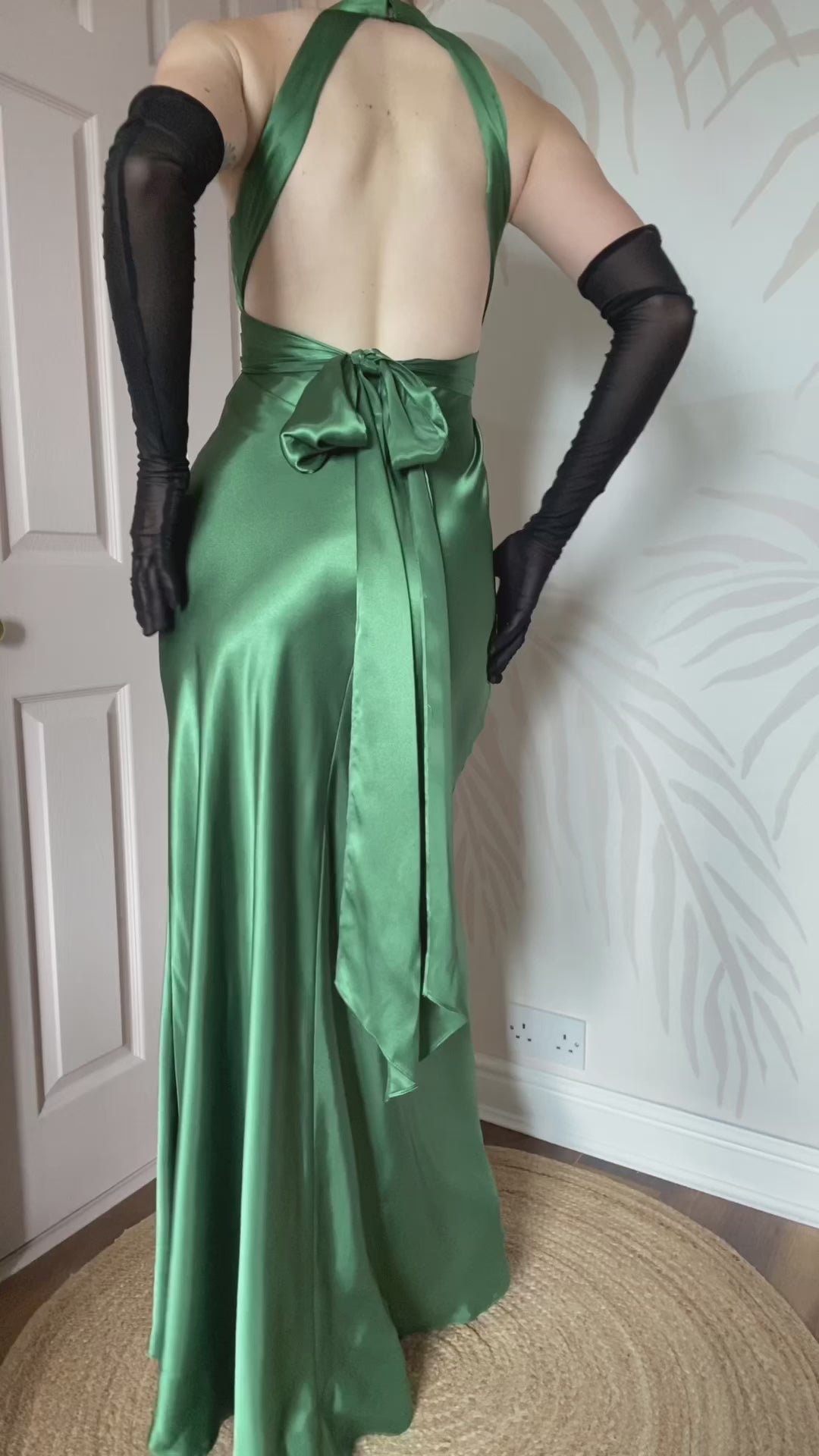 Green satin evening gown with a diamanté detail bust, hook & eye fastening at the back of the neck, a zip up the back & a tie around the waist - the dress isn’t lined UK 8