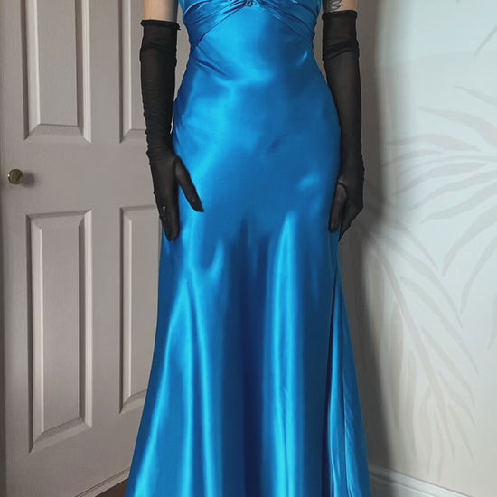 Sapphire evening dress with an open back, longer trail down the back, a beaded bust, hook & eye fastenings at the back of the neck, a zip up the back & a Tie around the waist UK 12 - the dress isn’t lined from the bottom of the bust down to the bottom hem