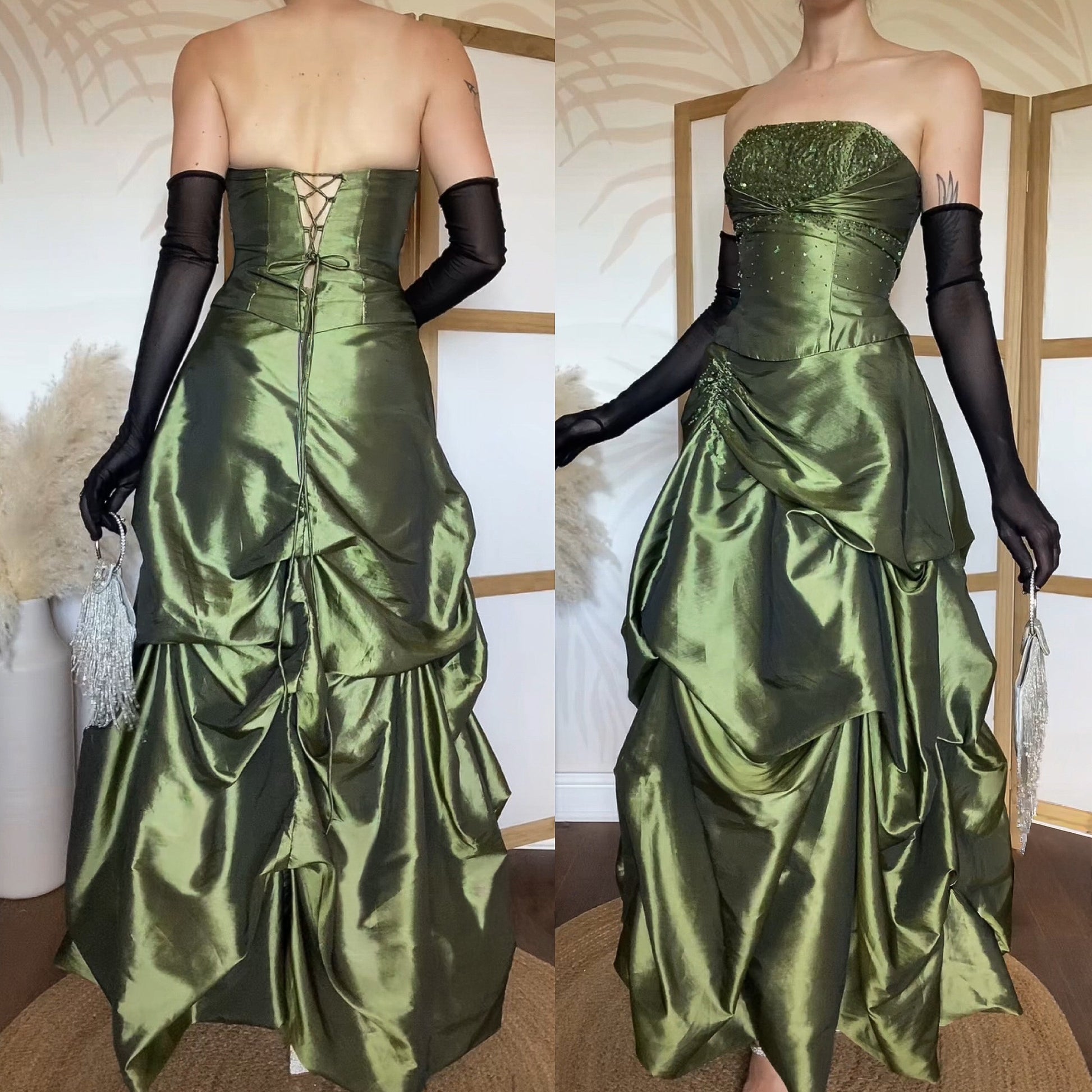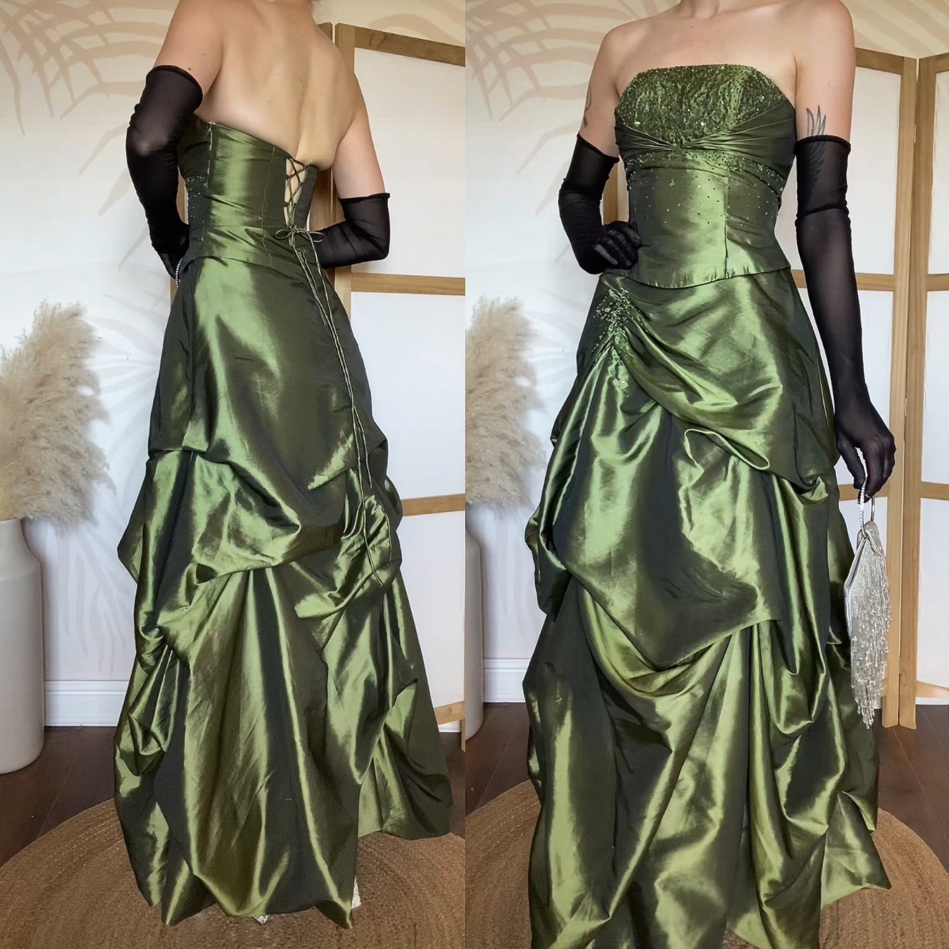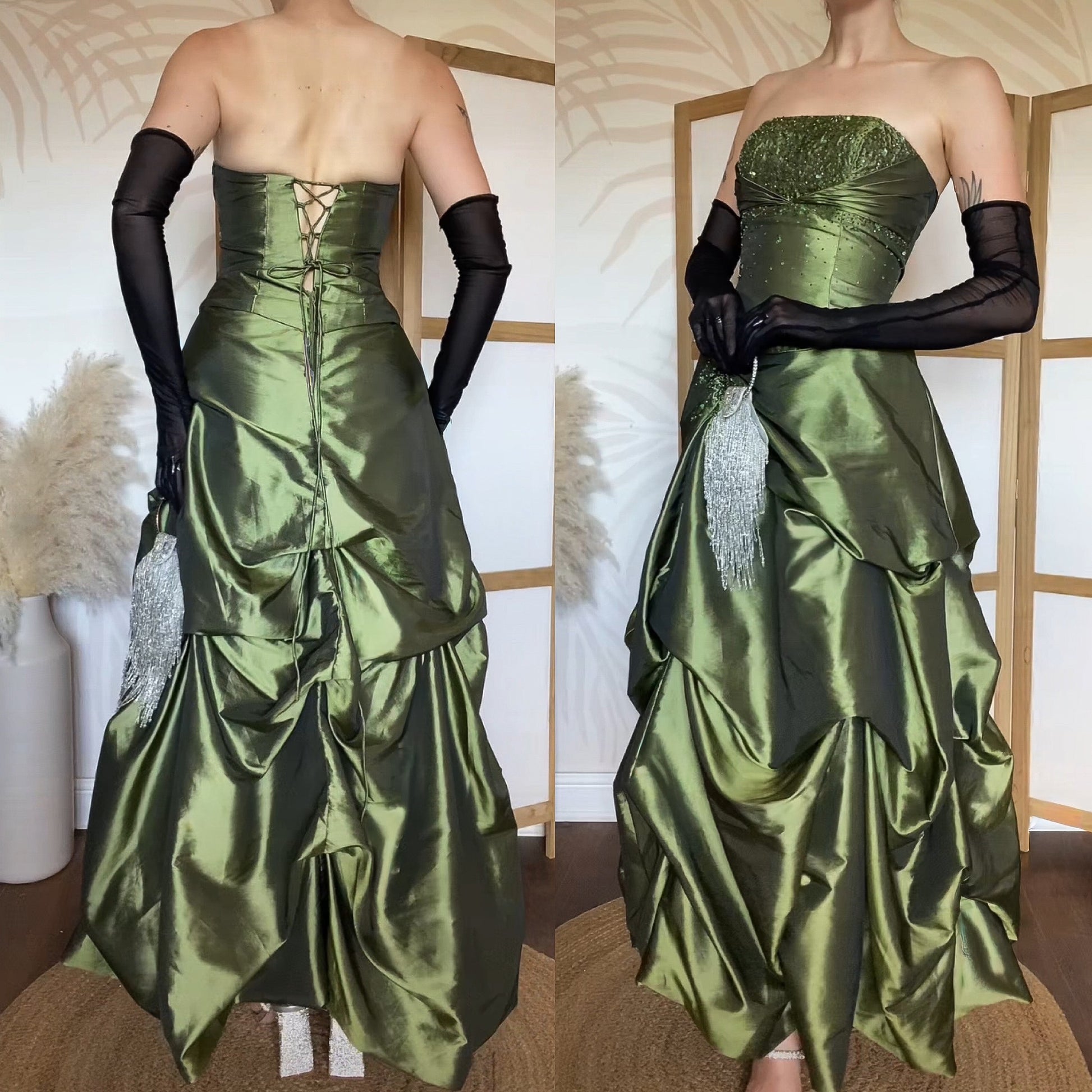 Green taffeta strapless draped prom dress with a netted underlay to hold the shape of the dress, a padded beaded bust, a boned bust & waist, an adjustable lace up back & a zip up the back uk 10