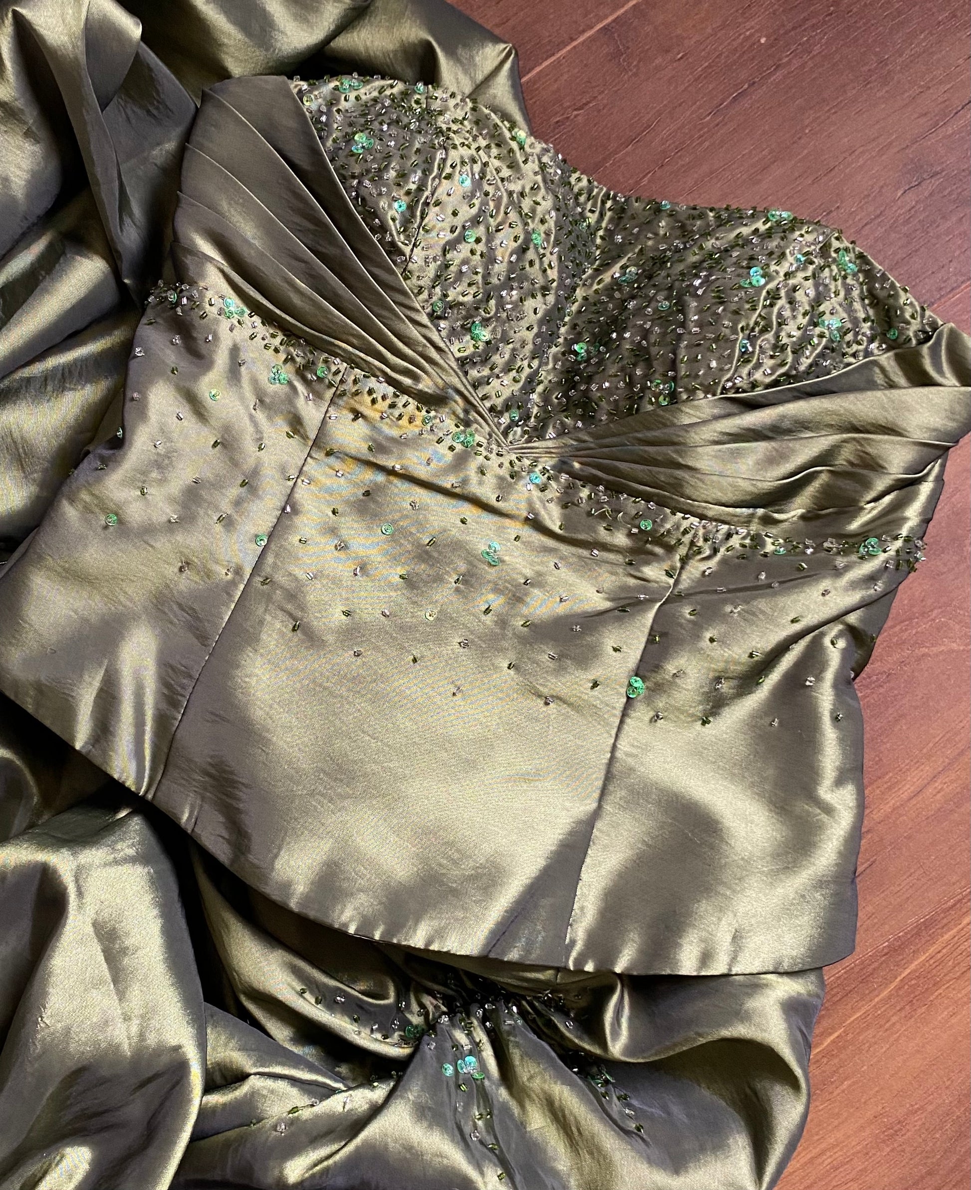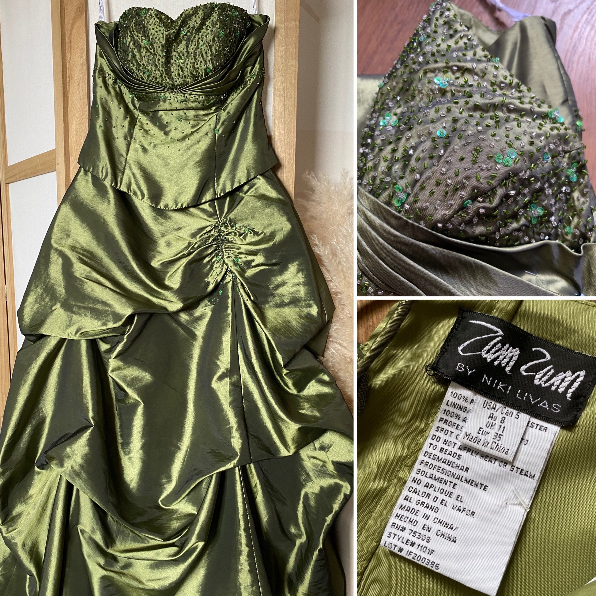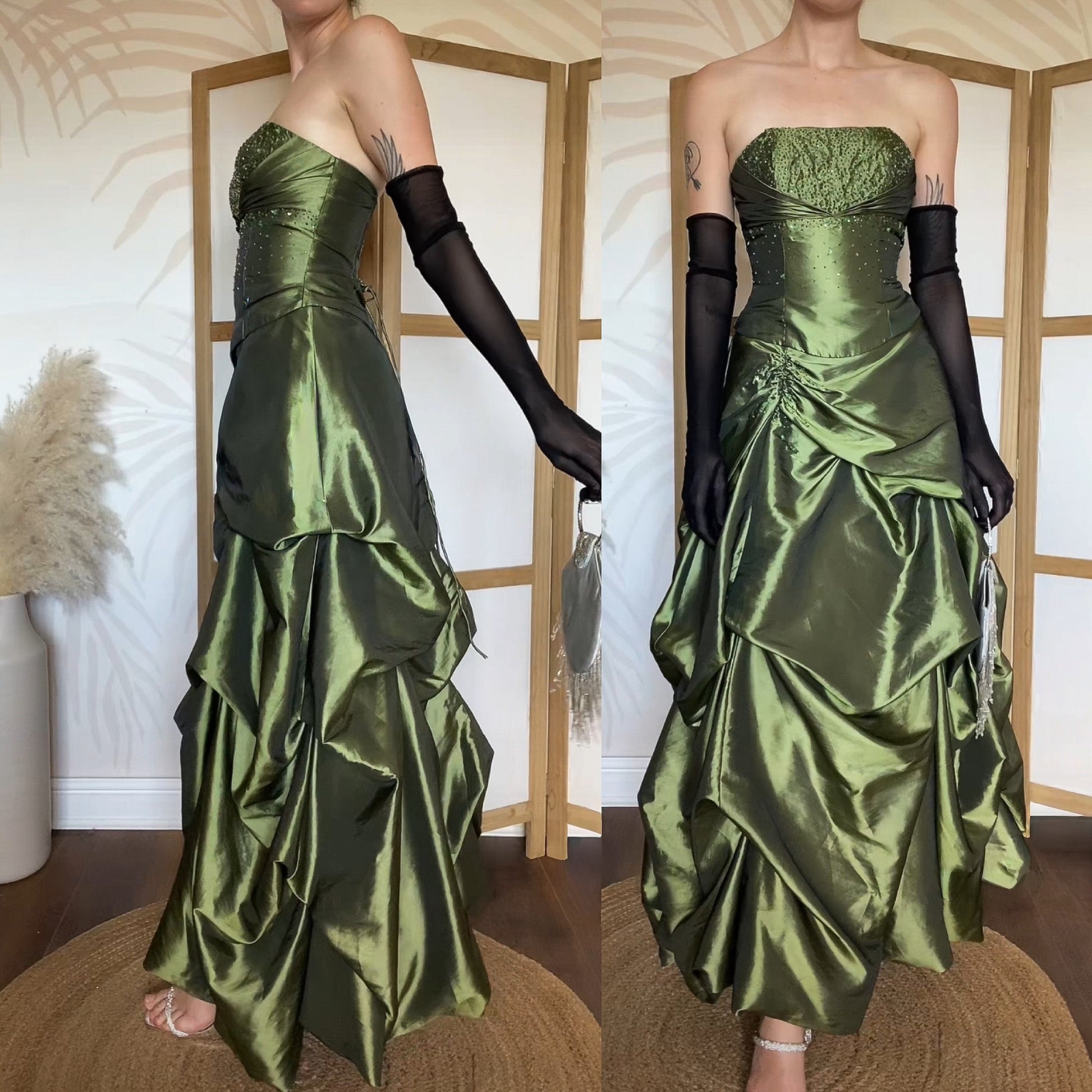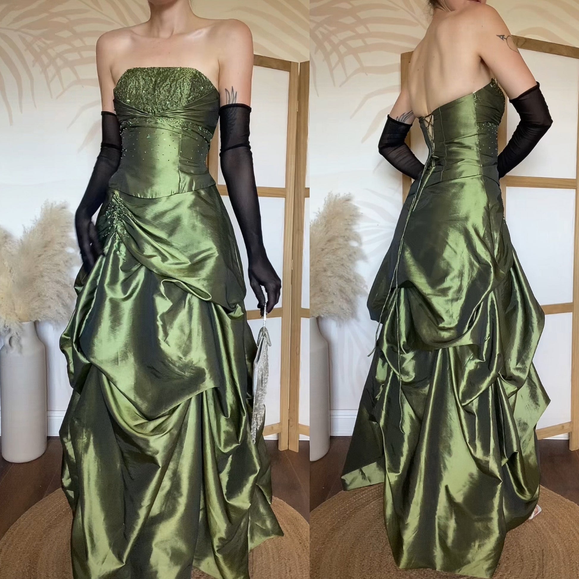 Green taffeta strapless draped prom dress with a netted underlay to hold the shape of the dress, a padded beaded bust, a boned bust & waist, an adjustable lace up back & a zip up the back uk 10